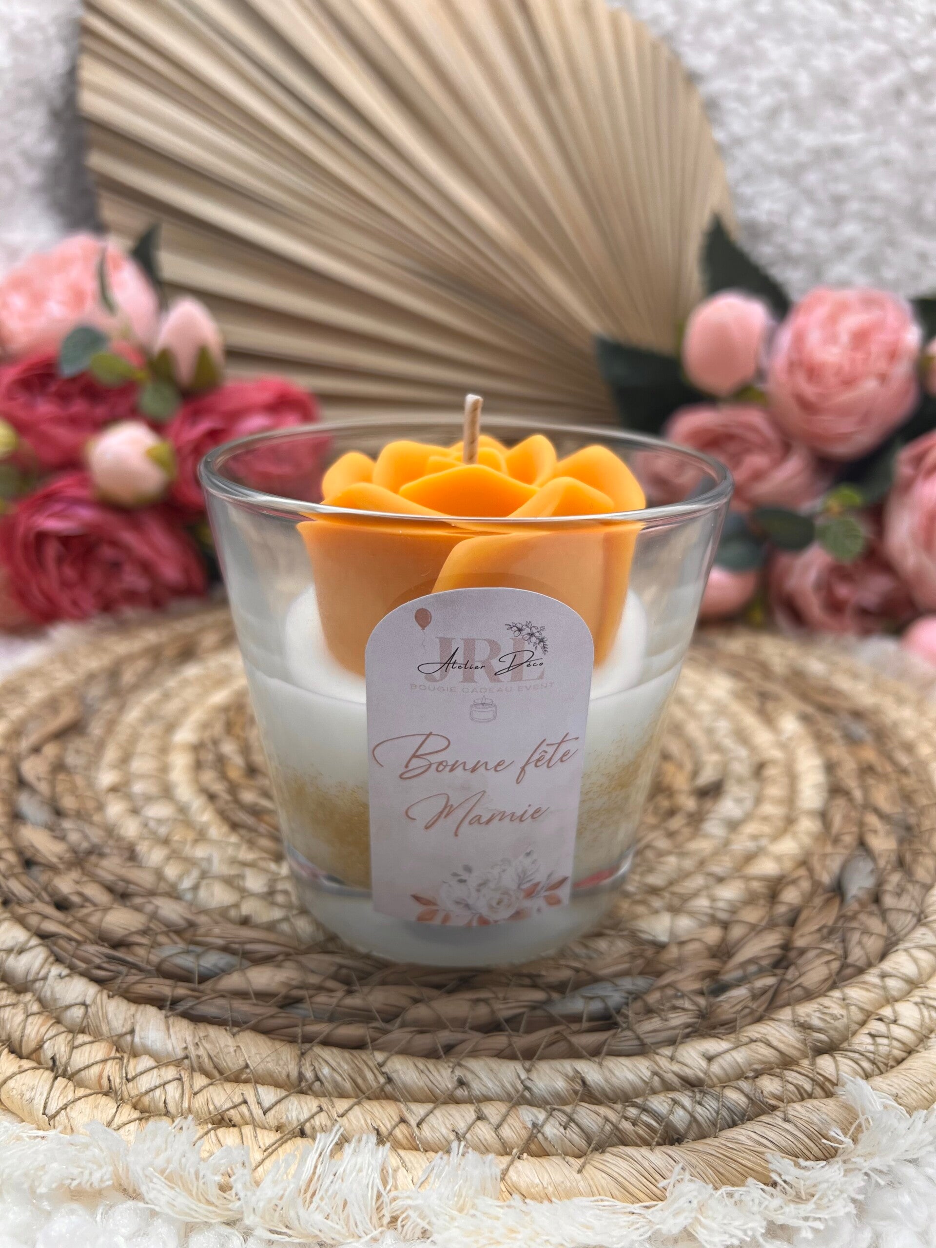 La bougie Bonne fête mamie plaira à coup sûr avec son doux parfum de vanille épicée ou d'orchidée noire, elle est réalisée dans notre atelier dans la Drôme provençale.
